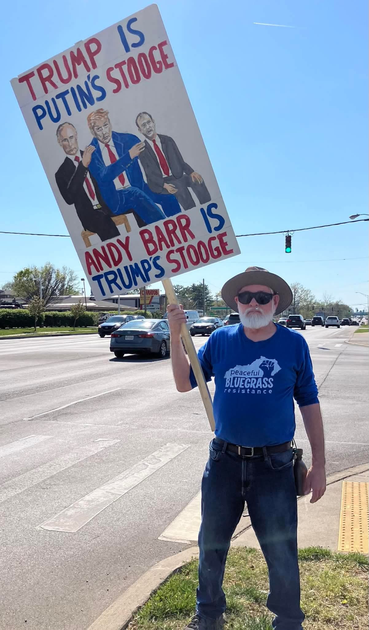 Lexington, KY, Peaceful Bluegrass Resistance protesting down the road from Keenland racetrack trying to catch the eye of some happy racegoers. Got lots of honks!