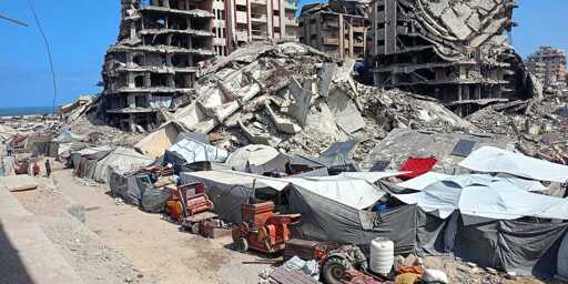 Tents erected on the rubble in western Gaza City. August 28, 2025. (Photo by Rasha Abu Jalal)
