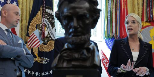 White House Deputy Chief of Staff Stephen Miller (L) and U.S. Attorney General Pam Bondi talk to reporters during an Oval Office availability with U.S. President Donald Trump on August 25, 2025 in Washington, DC. Photo: Chip Somodevilla/Getty Images