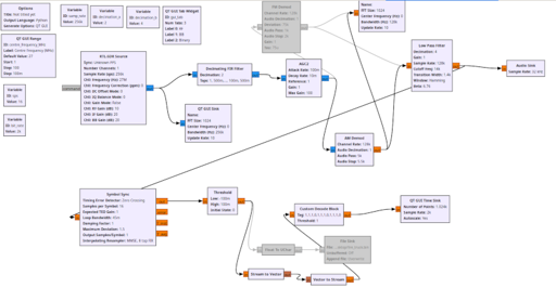 Some FFT decoding started to reveal the coding when someone pressed a remote button. None of the standard GNU Radio blocks would get the right decoding, so that called for a custom Python block.