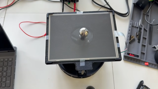 The heart of the build is a flat platform fitted with a resistive touchscreen panel on top. The panel is hooked up to a Teensy 4.0 microcontroller. When a heavy ball bearing is placed on the touch panel, the Teensy is thus able to accurately read its position. It then controls a pair of NEMA 17 stepper motors via TCM2208 drivers in order to tilt the panel in two axes in order to keep the ball in the centre of the panel. Thanks to its quick reactions and accurate sensing, it does a fine job of keeping the ball centred, even when the system is perturbed.