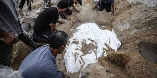 The bodies of Palestinians are buried after taking them from al-Shifa Hospital for funeral process in Gaza City, Gaza on September 23, 2025. (Photo by Khames Alrefi/Anadolu via Getty Image).