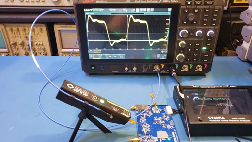 Because the probe is pretty hefty, it comes with a tripod that can hold it while you use it. [Kerry] connects some probe adapters to a PCB with two square wave oscillators. Square waves are a good test waveform because they have odd-numbered harmonics that rise well above the target frequency.