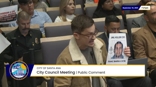 Jocelyn Pacheco referred to June, when Councilmembers Valerie Amezcua and David Penaloza disappeared as heavy ICE raids began and National Guard troops occupied the streets. Santa Ana police were used to violently repress protesters with rubber bullets and tear gas. Amezcua and Penaloza collectively received over $300,000 in campaign support from the Police Officers Association in 2022 alone.