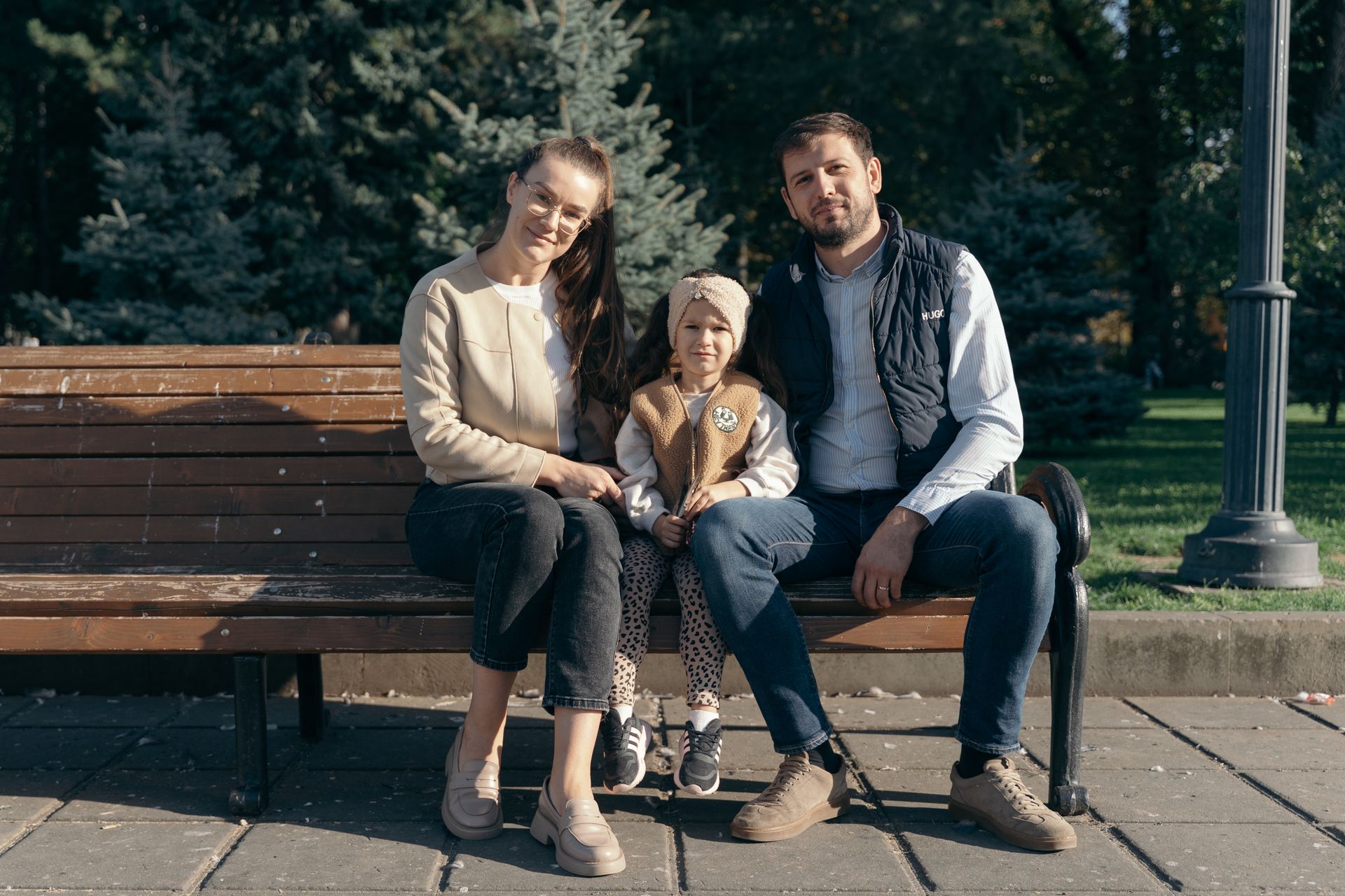 Oxana (L), 31, Daniel ®, 32, and their daughter in Chișinău, Moldova, on Sept. 28, 2025. (Florian Scheible / The Kyiv Independent)