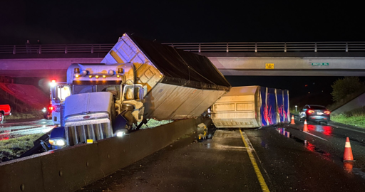 The crash happened just after 8 p.m. near the Whatcom Road exit, with a truck flipping its load onto the road. Police said that no one was injured.