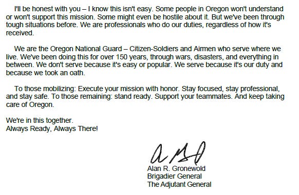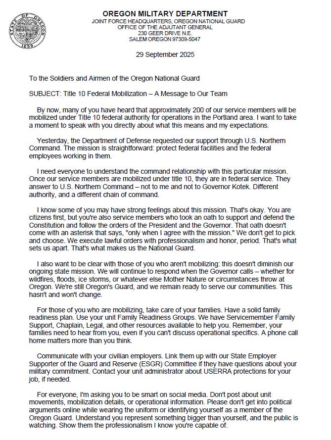 The head of the Oregon National Guard today sent a level-headed message to his troops in a letter that I’ve obtained. It could not be more different in tone than the inflammatory language of Trump and Hegseth at their military pep rally today in Quantico.