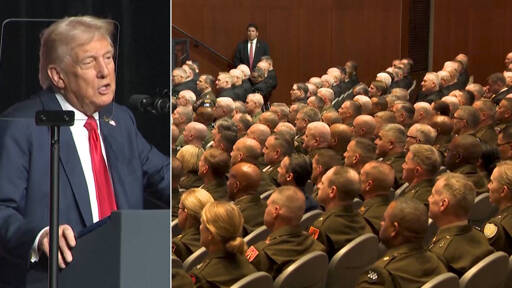 At an unprecedented gathering of hundreds of top generals and admirals from U.S. military installations around the world, President Trump delivered a rambling speech Tuesday alongside Defense Secretary Pete Hegseth. They laid out their vision of a “warrior” culture in the U.S. military and claimed the United States is facing an “invasion from within.” Eugene Fidell, a military scholar at Yale Law School, says the meeting was a means of “exacting loyalty, special loyalty, from the most senior officers and enlisted personnel” and that by promoting a solely “white male” image of the U.S. armed forces, the administration has made clear it “wants to turn back the hands of the social clock.”