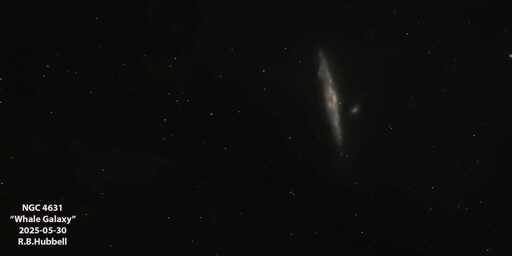 The Whale Galaxy, located 30 million light-years from Earth. In the upper left corner is the Hockey Stick Galaxy.