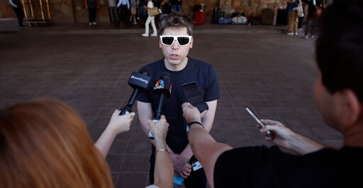 OpenAI CEO Sam Altman wears sunglasses and talks to reporters at the Allen & Company Sun Valley Conference in Idaho on July 8, 2025.