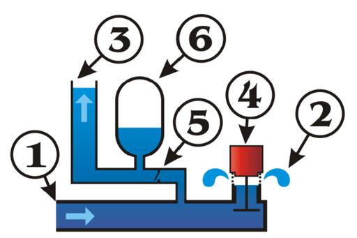 Eventually, drag from the water flow causes the waste valve to shut. When it does, this creates a pressure spike which opens the delivery valve and forces water up and out of to the delivery outlet. Hydraulic ram pumps can deliver water to great heights in this way, though flow is reduced with greater output head. Pressure vessels are sometimes installed in the pump to reduce the impact of pressure spikes and smooth the output flow. Eventually, the pressure spike subsides, the delivery valve closes, and the waste valve reopens due to gravity, and the cycle begins again. Credit: author