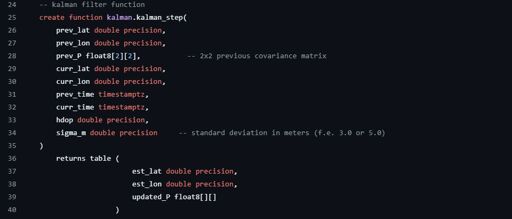 Using a Kalman Filter is highly desirable when you’re doing something like vehicle tracking using both dead-reckoning and GPS coordinates, as it filters out noise that can be the result of e.g. GPS reception issues. As noted in the article, transferring state from one row to the next requires a bit of lateral thinking, but is doable with some creative SQL usage. As PL/pgSQL is very similar to Oracle’s PL/SQL, this same code should work there too without too much porting required.