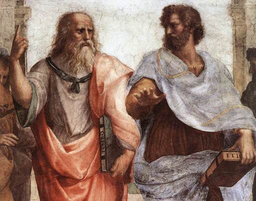 The School of Athens fresco features Plato (left), holding his Timaeus while he gestures to the heavens. Aristotle (right) gestures to the earth while holding a copy of Nicomachean Ethics by Raphael.