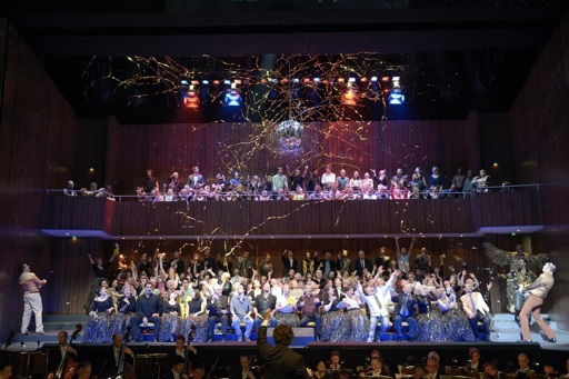 Berliner Jan Bosse directed the production, with the sets by Stéphane Laimé. The theatrics began even before the overture, with the chorus already arrayed on stage in raked seating that meticulously mirrored the real auditorium on the other side of the pit. The seats, handrails and even the 1960s veneer of dark wavy grain on the walls had all been mimicked in the service of the by now hardly original gag of holding up a mirror to the audience.