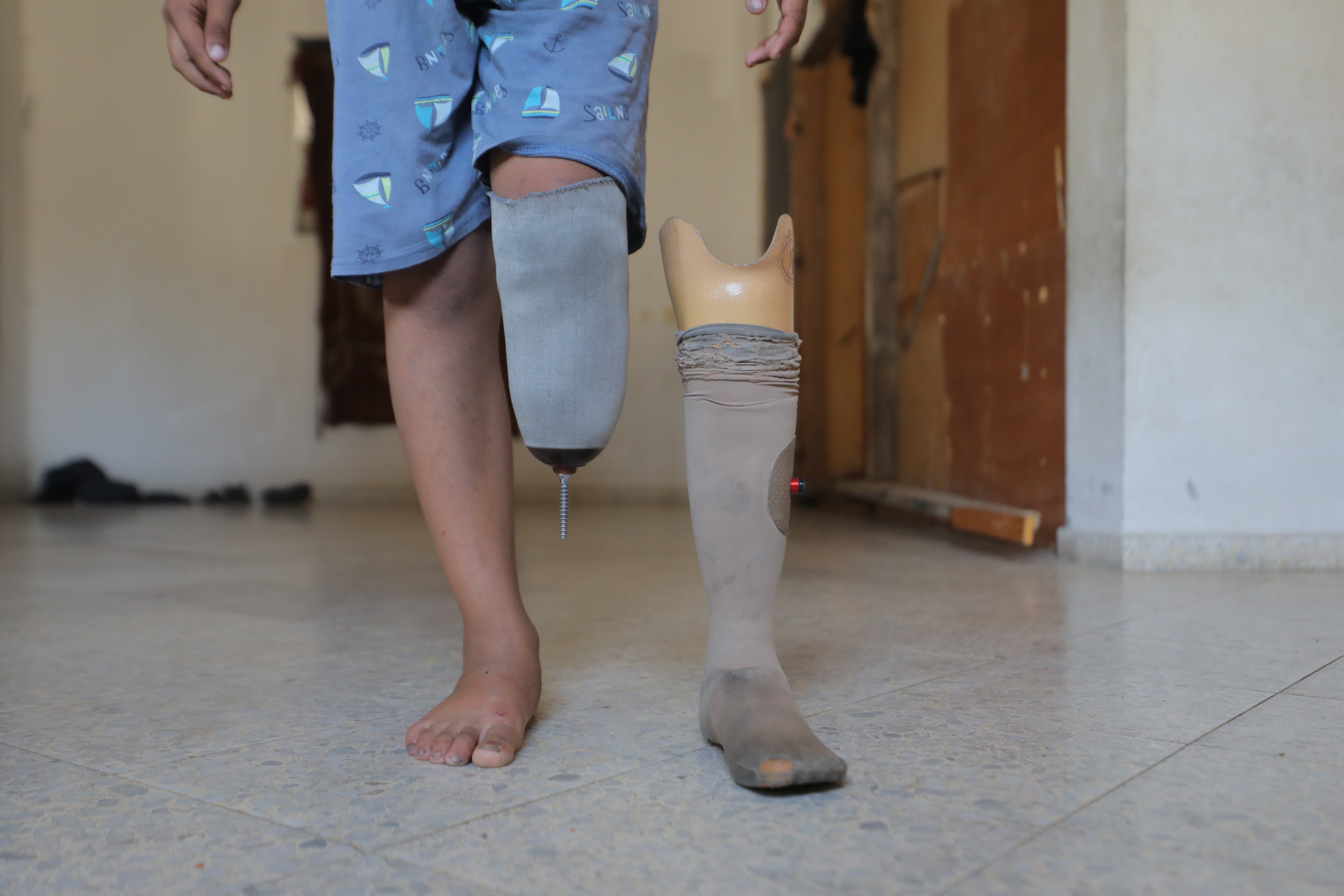 Abdulrahaman El-Nashash, a 12-year-old boy seriously wounded in his left leg during an Israeli strike, had his leg amputated following surgery in Gaza. Photo by Hassan Jedi/Anadolu via Getty Images.