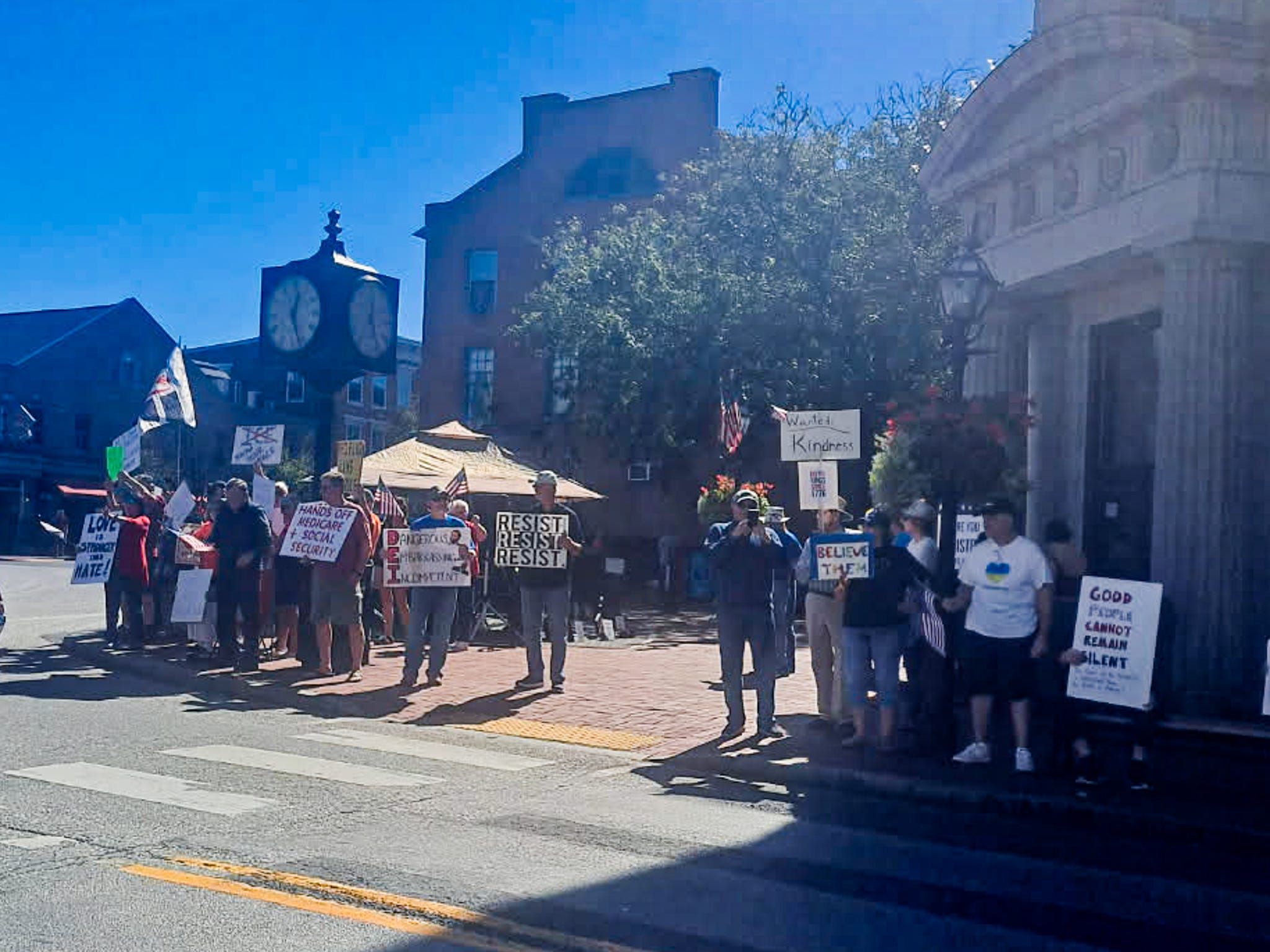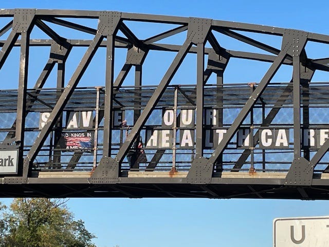 Below, “We posted this protest sign up over NJ state highway 1 on 10/3: “SAVE OUR HEALTHCARE”.