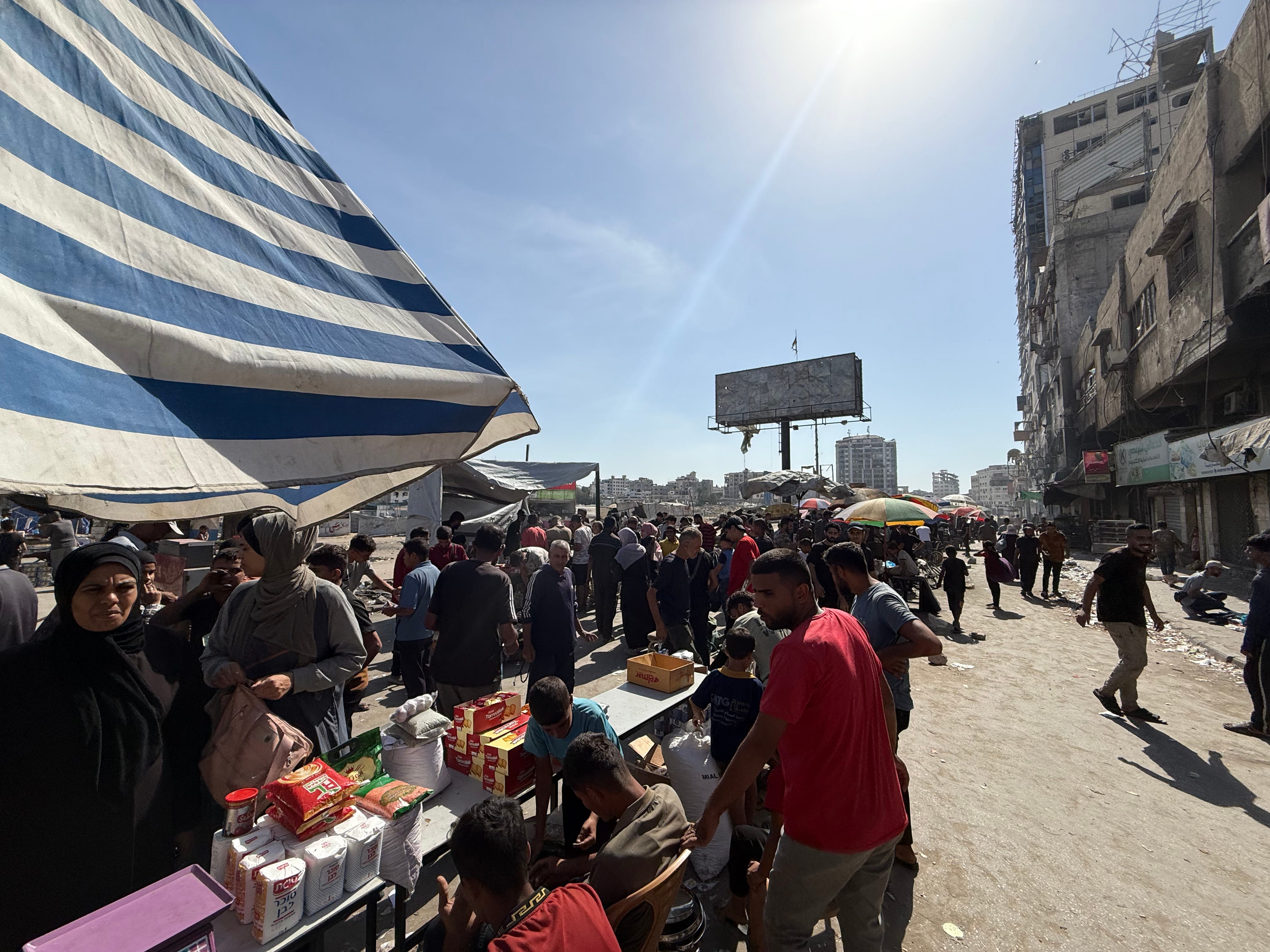 The few vendors gather in areas like Al-Saraya intersection in Al-Rimal neighborhood in the west of Gaza City. The scant items available in the market stalls are both unaffordable and unhealthy—mostly sugary foods like Nutella, biscuits, cheese, biscuits, chips, and noodles that don’t provide the body with enough protein.