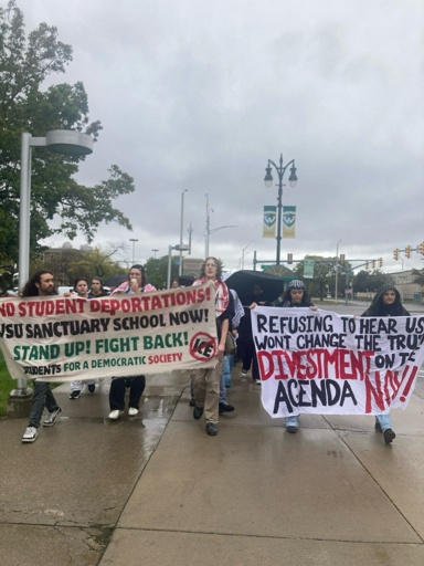 At the same time, the student movement at Wayne State has grown and expanded due to the continued attacks from Donald Trump’s administration and Wayne State admin’s capitulation to the attacks. Next to SJP’s banner was SDS’s banner, calling for WSU to end student deportations. Alongside divestment, students demand administration stop assisting Trump and his attacks on their peers.