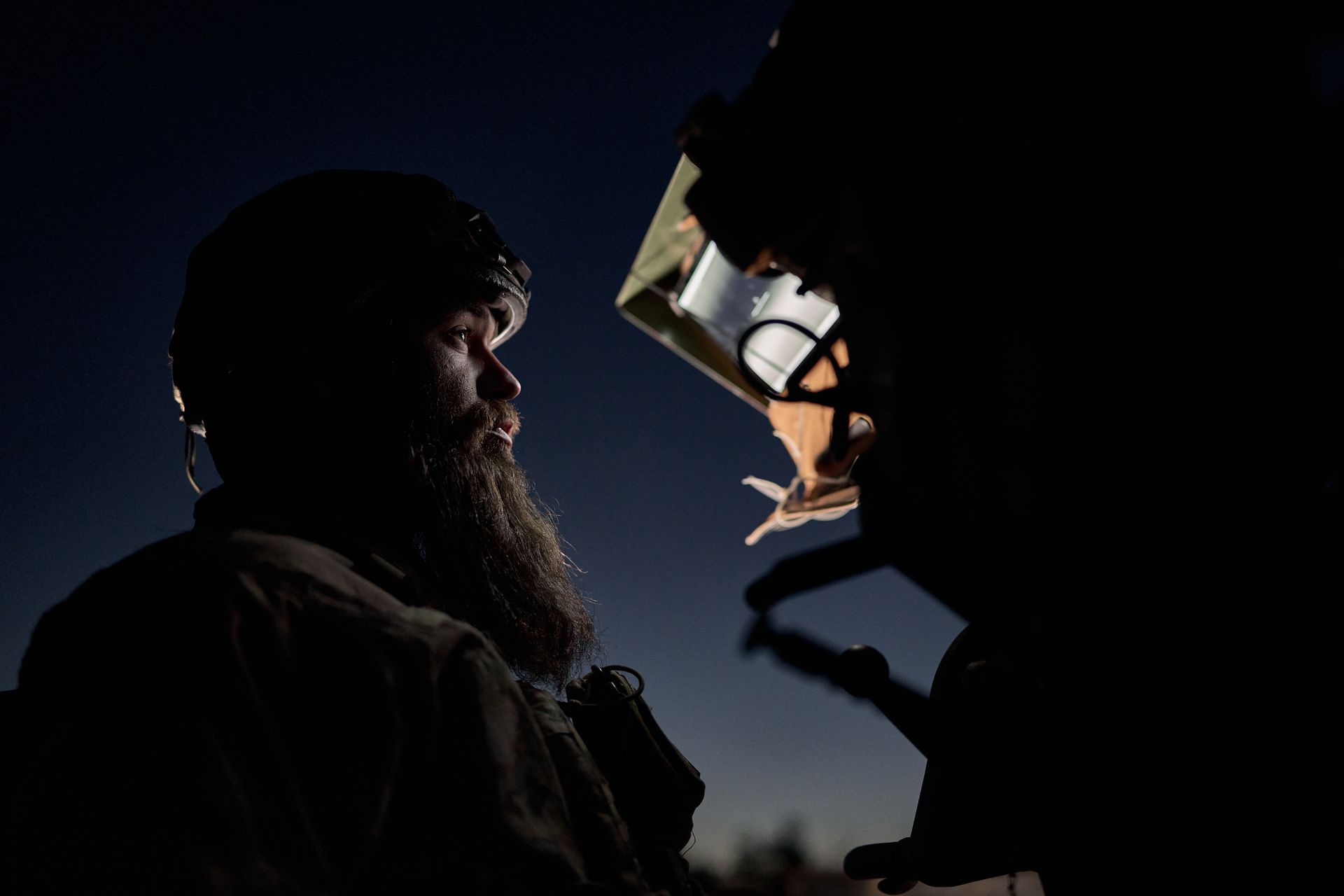 Soldiers of the 93rd Mechanized Brigade “Kholodnyi Yar” operate a twin-barreled 23mm ZU-23 anti-aircraft gun equipped with a thermal imaging camera, hunting for night-flying drones and Shahed loitering munitions, in Donetsk Region, Ukraine, on Aug. 15, 2025. (Kostyantyn Liberov / Libkos / Getty Images)