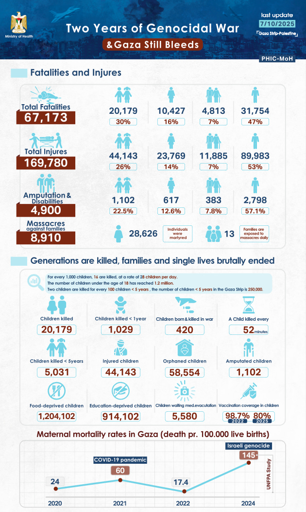 To mark two years of Israel’s genocidal war, the health ministry on Tuesday released an infographic with details on Palestinians killed and wounded in Gaza, including: