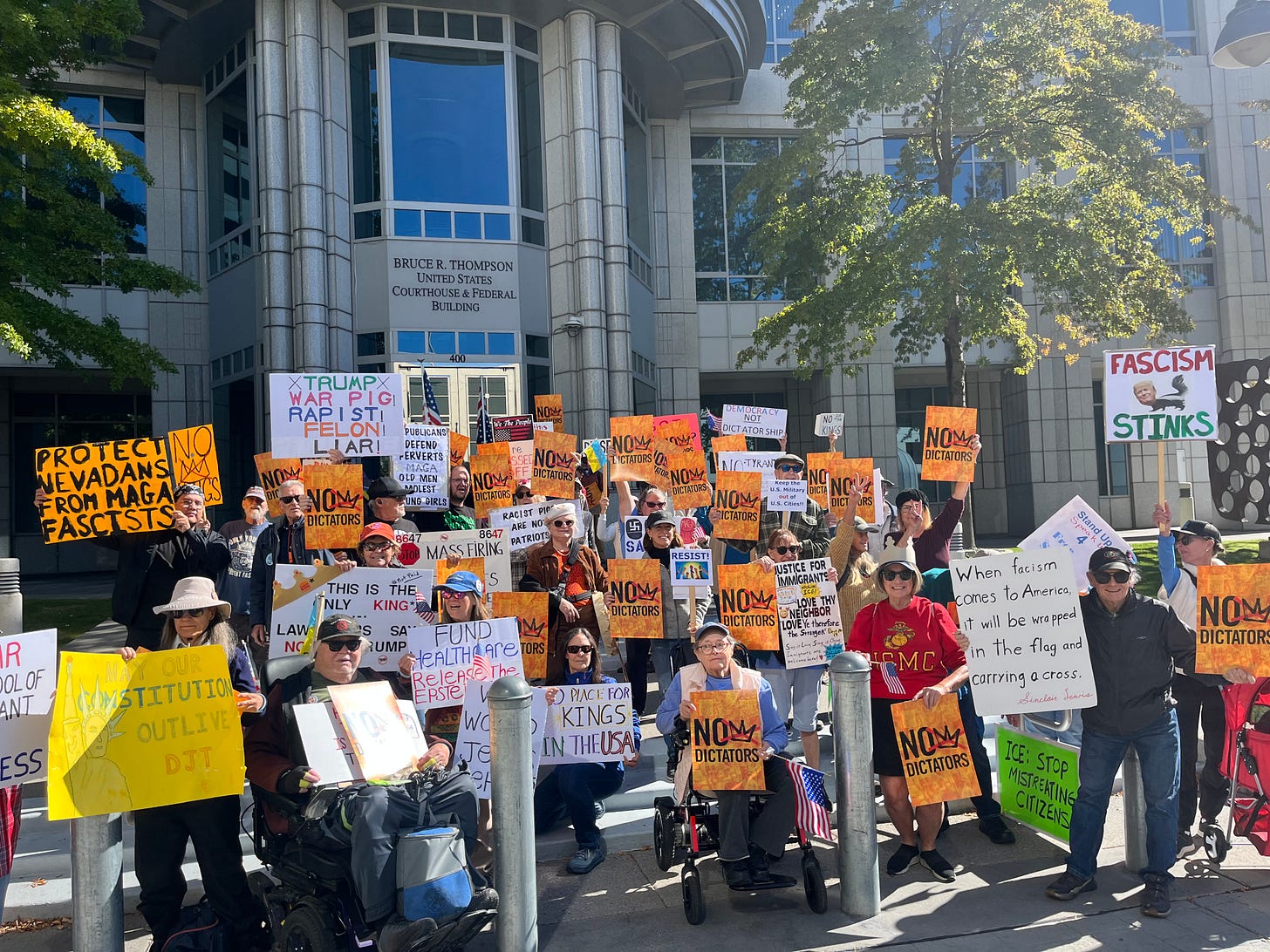 Below, a photo from reader Eric L. with a note: “Every Tuesday in Reno in front of our federal courthouse we have Tyranny Tuesday protests. Here are a couple pics from today.”