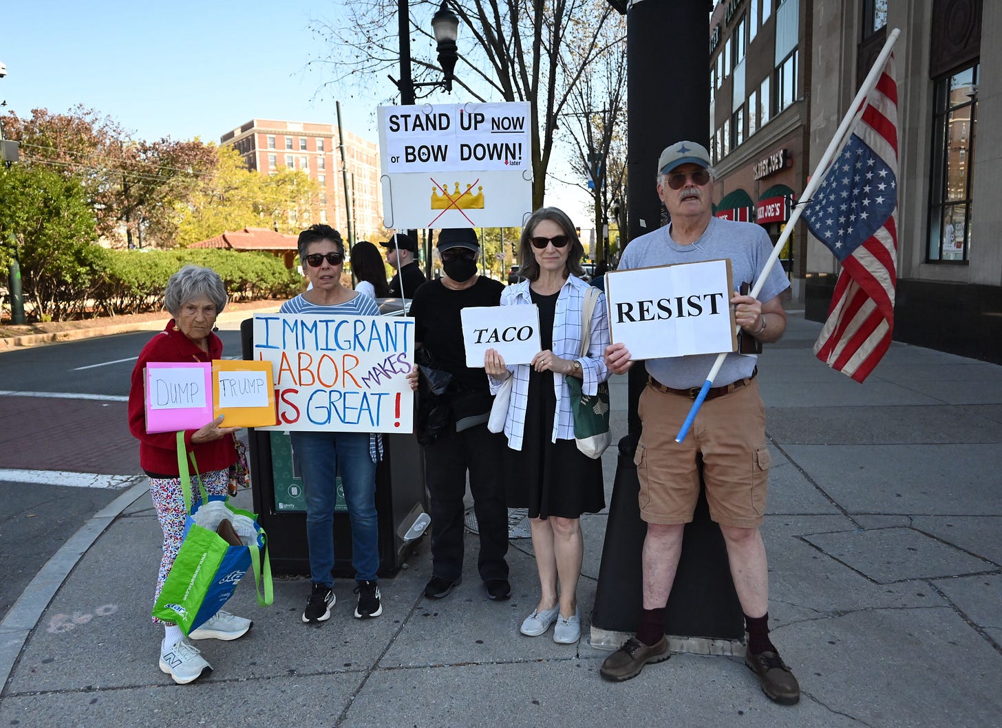 Below, two photos from reader Jonathan M., “Finally got a few photos from one of our weekly Stand Up for the Constitution protests in Brookline, MA.”