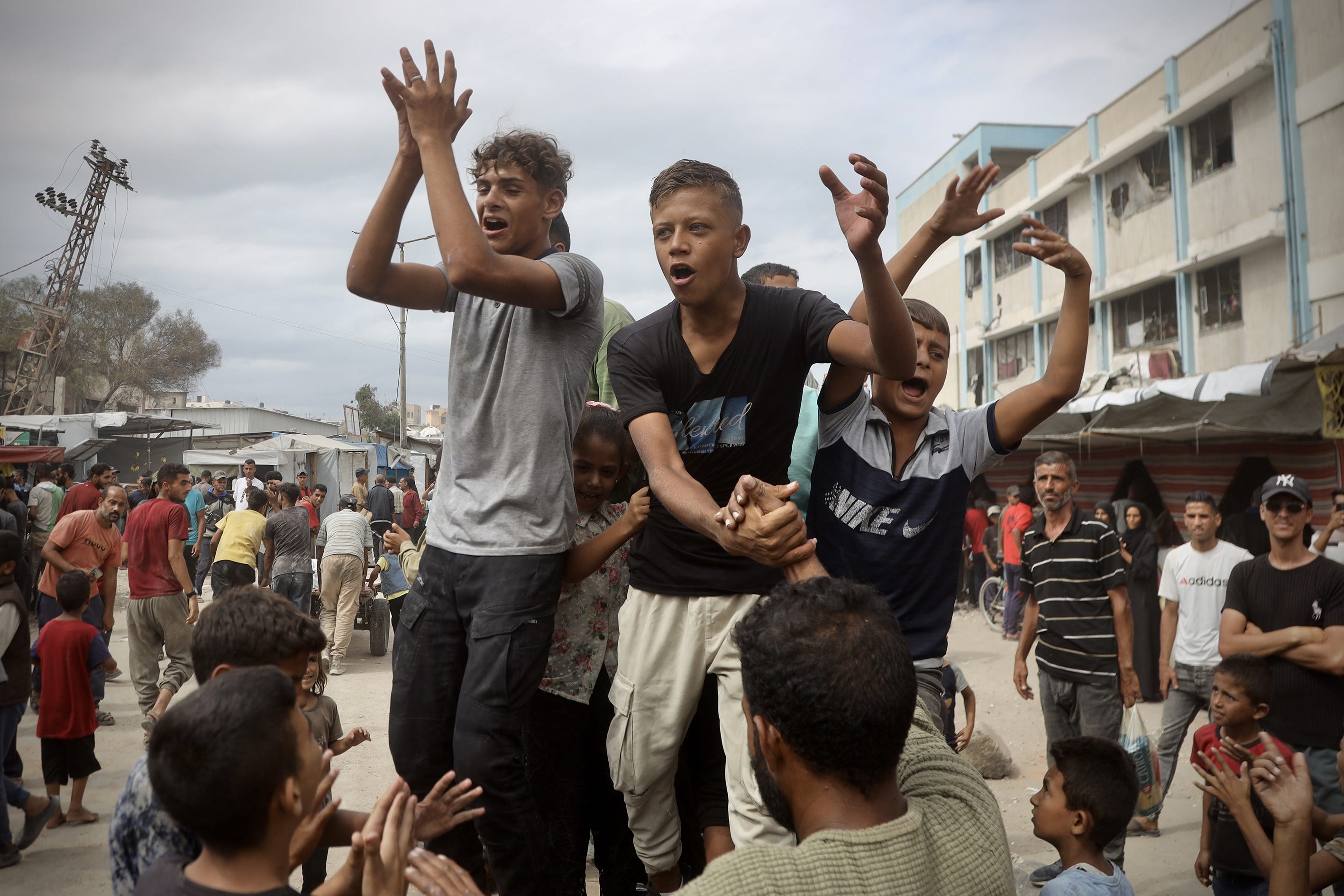 Palestinians gathered in the city of Khan Yunis to celebrate after the announcement of the ceasefire agreement in Gaza on October 09, 2025 in Khan Yunis, Gaza. (Photo by Abdallah F.s. Alattar/Anadolu via Getty Images)