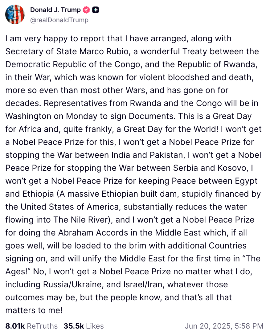 He’s been insisting that he “deserves” the Peace Prize since since his first term, and he’s only grown more fixated on it. He’s mentioned the award publicly every few weeks since taking office again in January and often complains that he doesn’t think he’ll get it. Here’s typical lament, which he posted to Truth Social in June: