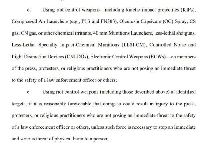 - In response to these incidents, Federal Judge Sara Ellis has issued a restraining order barring DHS from using riot control weapons “on members of the press, protestors, or religious practitioners who are not posing an immediate threat to the safety of a law enforcement officer or others.”