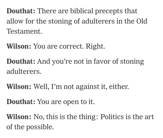 - In an interview with the NYT’s rightwing columnist Ross Douthat, Douglas Wilson, the Christian nationalist pastor with ties to Pete Hegseth, who wants to turn the US into a theocracy, refused to denounce stoning as a punishment: