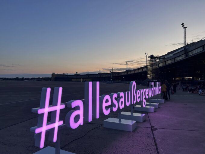 The Komische Oper has real flair, whether putting on a show in an opera house or in an empty airplane bay looking out at a dusky runway. In an ad hoc bar area the size of at least two football fields, sofas had been set up with more than ample space between them. The clink of champagne glasses echoed off the trusses high up in the cantilevered dimness. A neon sign marked off this vast ad hoc opera foyer from the airfield beyond, resisting the gathering dark with its message of #allesaußergewöhnlich (everything extraordinary). That said it all—in lurid pink.
