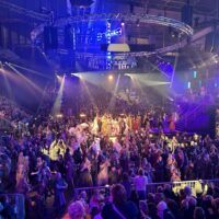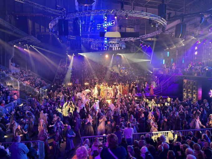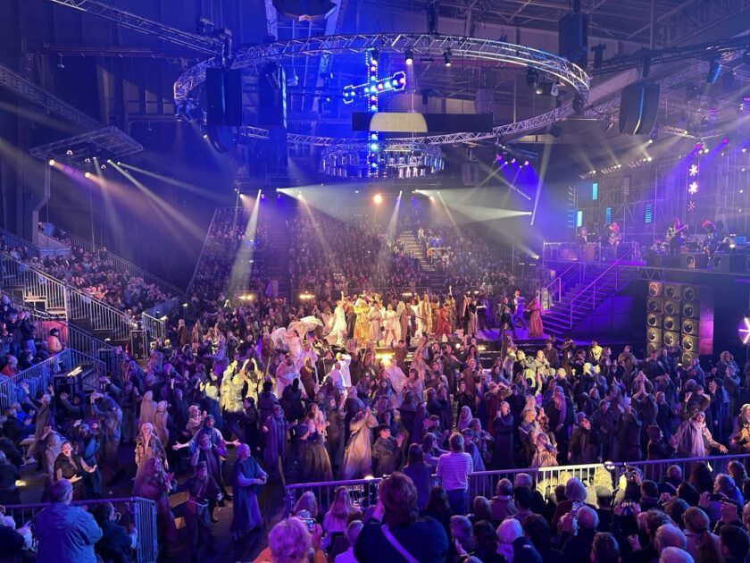 The cavernous hangar was filled to capacity—enough people to fill several 747s—and all were ready for a theater evening that, in the end, brought everyone into the show in a singalong encore of the title tune.