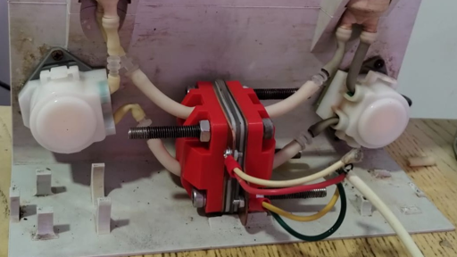 A red, cuboid electrochemical cell is in the center of the picture, with a few wires protruding from the front. Tubes run from each side of the cell to a peristaltic pump and tank on each side. The frame holding the pumps and tanks is white 3D printed plastic.