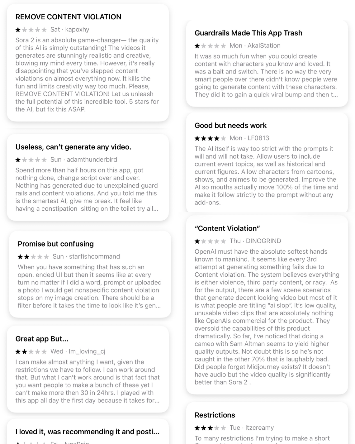 Judging by App Store reviews, though, it seems like people aren’t entirely happy with Sora. Some of the complaints dragging on its rating — it’s at 2.8 stars out of 5, compared to 4.9 for ChatGPT or 4.6 for Google — are straightforward and easily addressed: it’s sort of glitchy; the voices aren’t as good as they could be; some generations are uncanny or unconvincing; the app, despite being free, is invite-only, which can make for a disappointing download. But the most popular complaint by far is one that OpenAI can’t easily deal with. It’s that the app has rules: