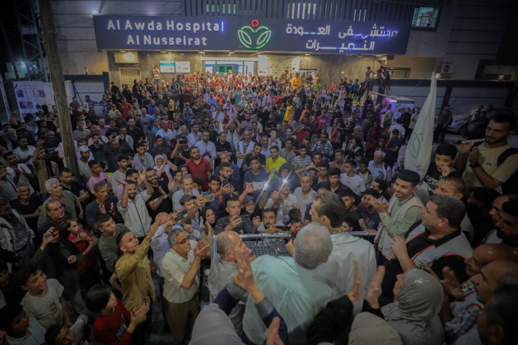 Health workers and patients gathered to meet Dr. Muhanna near Al-Awda Hospital in Gaza upon his release. Source: Awda Health and Community Association/Facebook