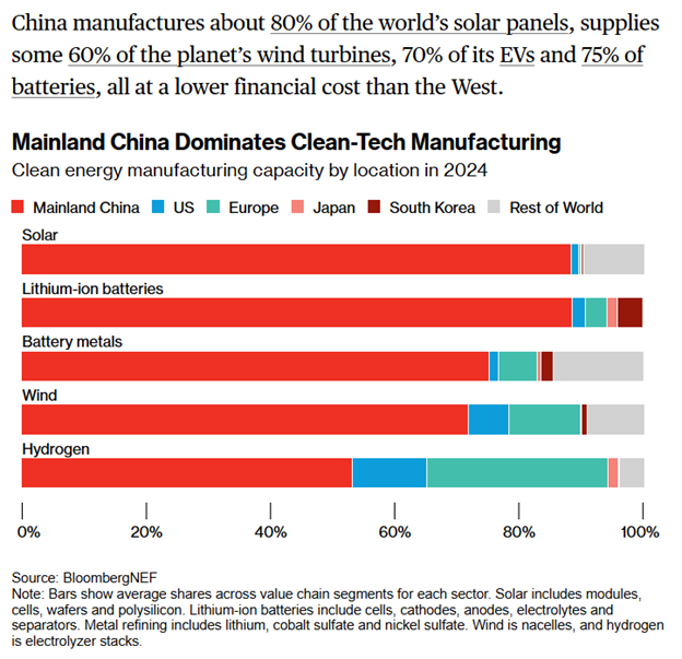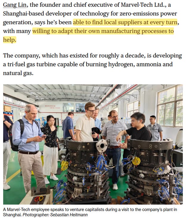 This entire piece is excellent, and it’s paywalled so we’ll share almost all of it onscreen. A group of Venture Capitalists visited China and saw firsthand, for themselves, China’s dominance in clean tech. And again it doesn’t matter what industry we put there, shipbuilding or electronics or robotics or cars. China’s advances everywhere make competition difficult, and these VC’s decided it’s pointless to try. They’re shutting down new investments in companies unless the projects are somehow in partnership with firms here. This is a regular feature too, that China has prioritized energy security—along with food security and technological security and transportation and medicine. Their economic system is ruthless and failure rates are high, and China is localizing all the supply chains for everything possible. Western companies can’t catch up.