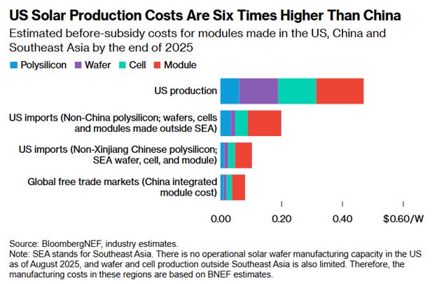 Another problem: all this happens at lower costs. In solar, production costs in the United States are six times what it costs here. And this table is misleading, because the US doesn’t even make solar wafers, and Southeast Asian countries produce almost all wafers and solar cells, so new firms either need to figure out how to build those, or buy those inputs from here anyway.