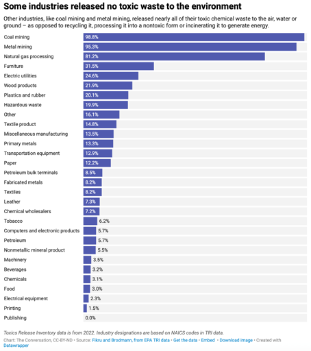 But facilities in different industries have different release rates. For example, about 99% of toxic chemicals from coal mines are released to the environment, compared with 81% for natural gas extraction, recovery and processing; 25% for power-generating electric utilities; and less than 3% for electrical equipment manufacturers.