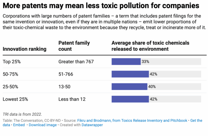 One corporate attribute we examined was innovation, which we measured by counting corporations’ patent families, which are groups of patent documents related to the same invention, even if they are filed in different countries. We found that companies with more patent families tend to release less of their toxic waste to the environment.