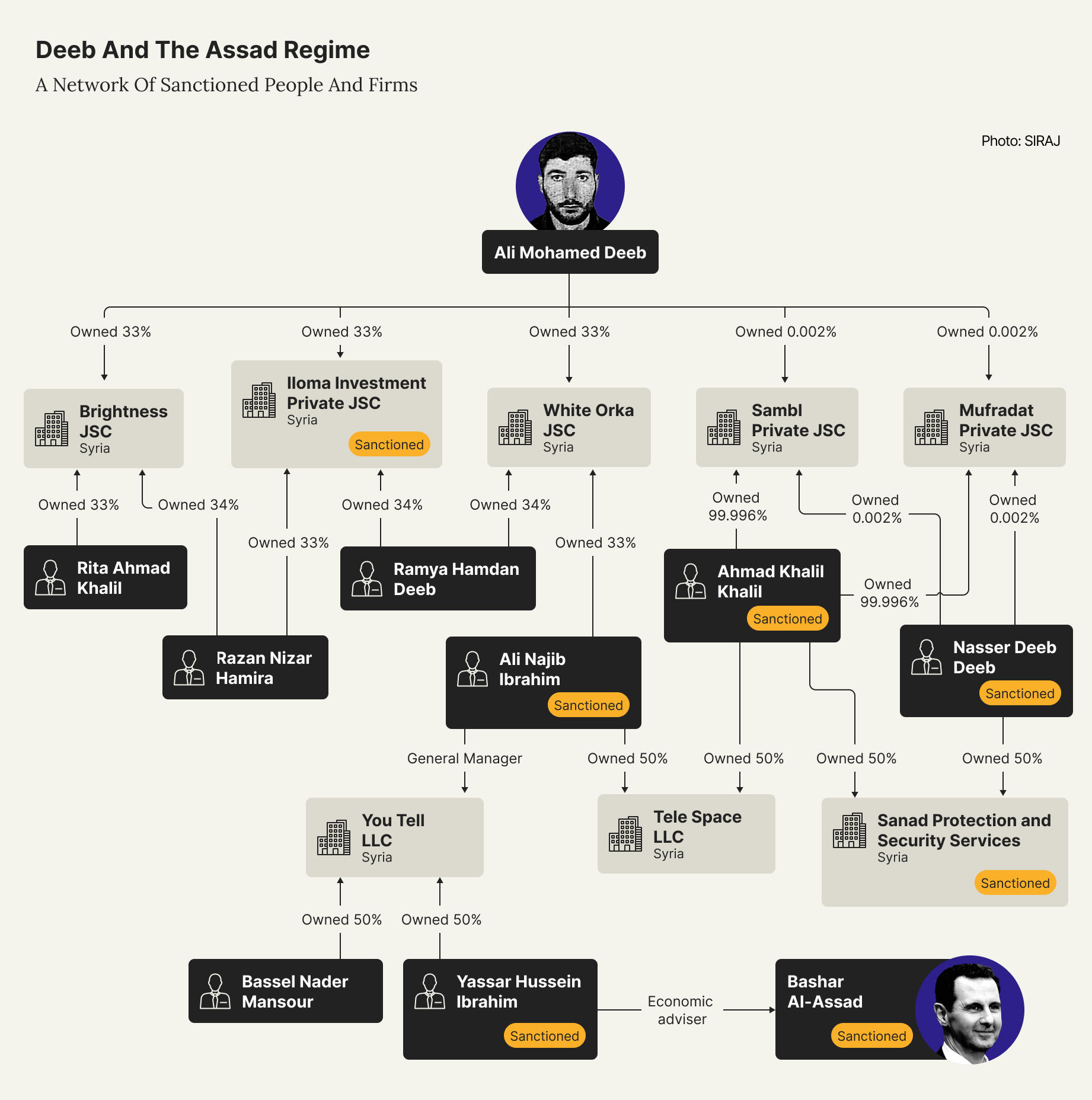 Syrian corporate records show that Deeb held stakes in companies with fellow shareholders sanctioned by the EU for supporting and benefiting from the Assad regime. (James O’Brien/OCCRP/SIRAJ)
