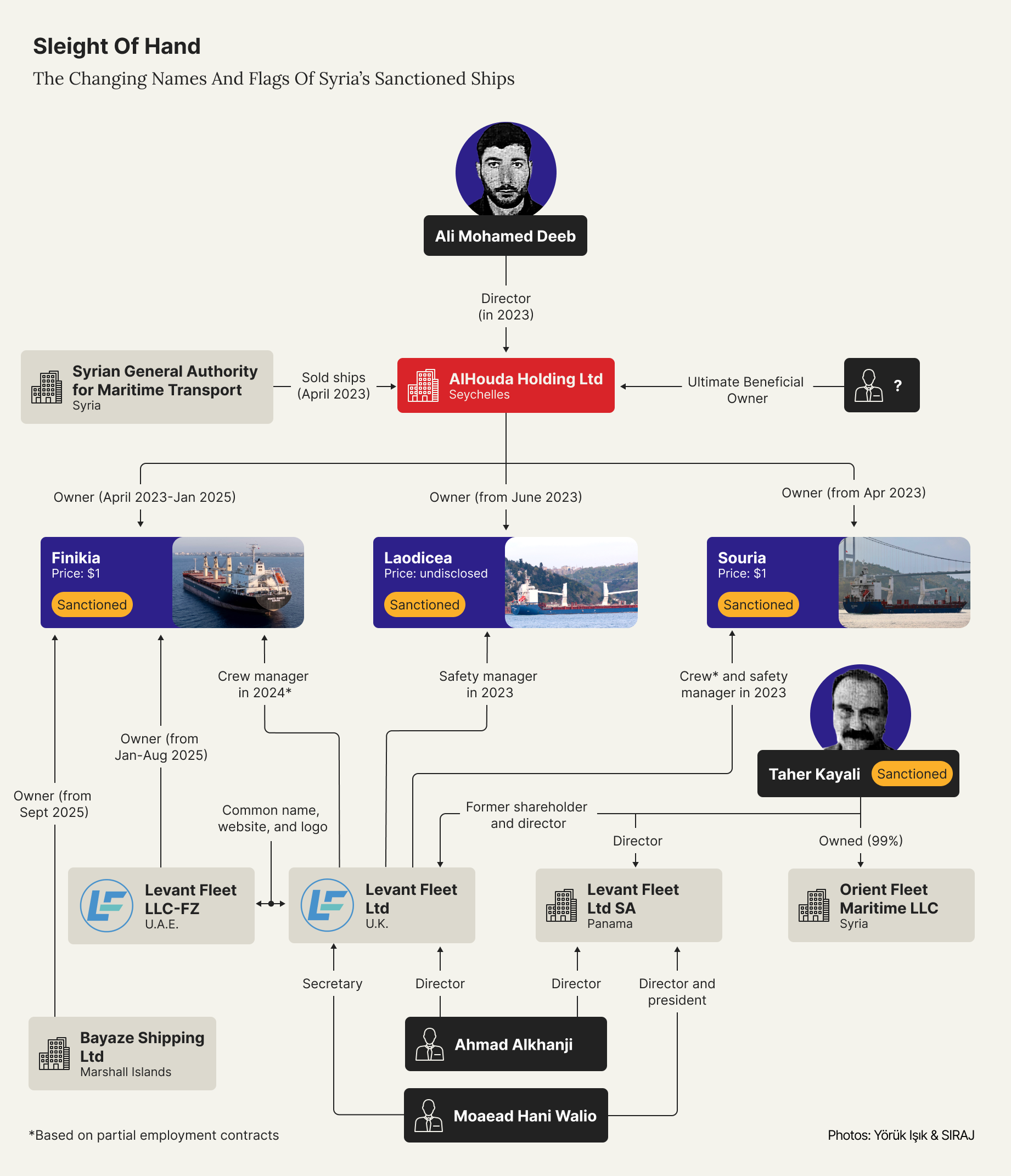 The U.K.-based Levant Fleet has served as the safety manager for the Laodicea and the Souria since 2023, according to the shipping database Equasis, and as a crew manager for the Souria and the Finikia in 2024, according to partial employment contracts obtained by SIRAJ.