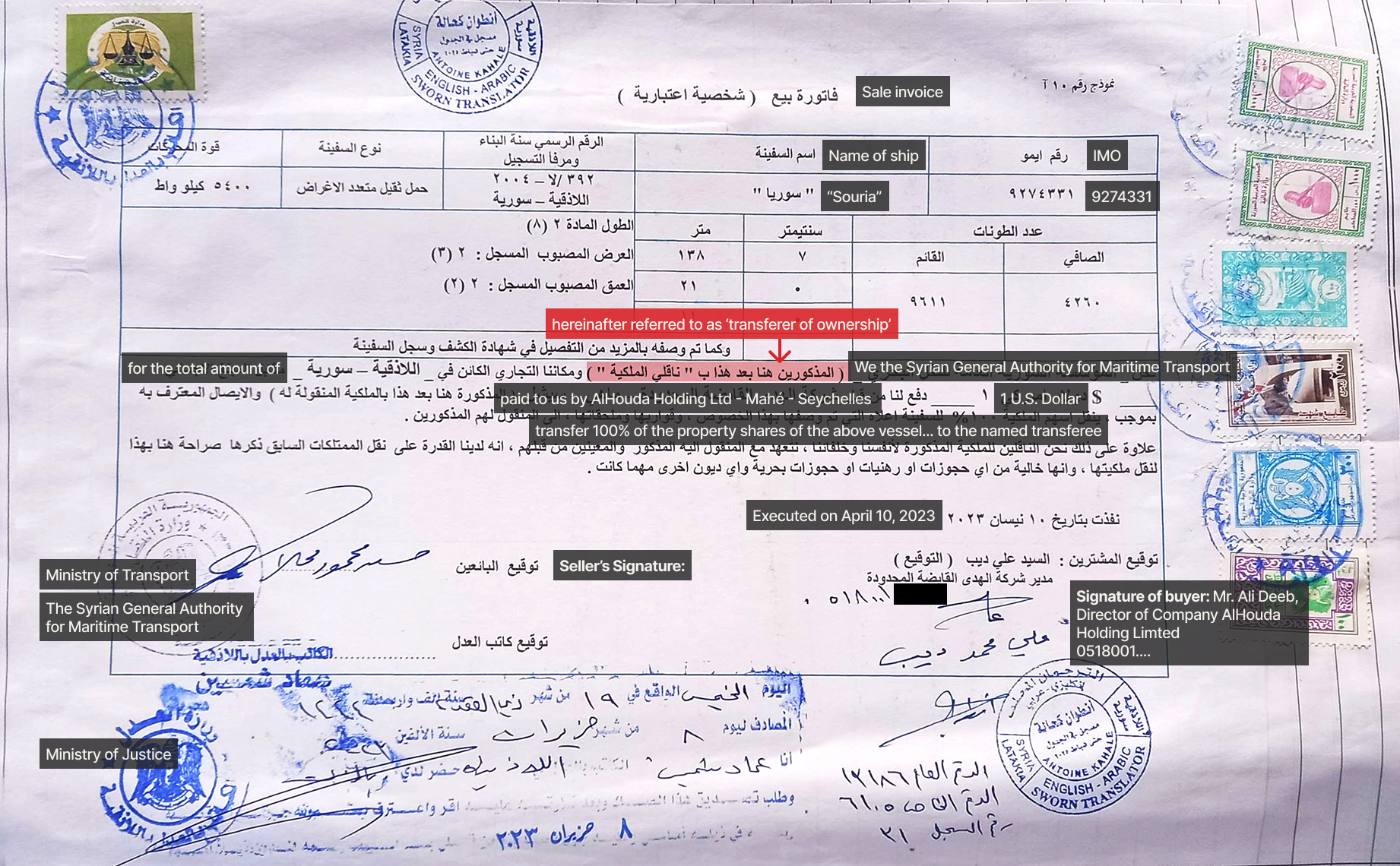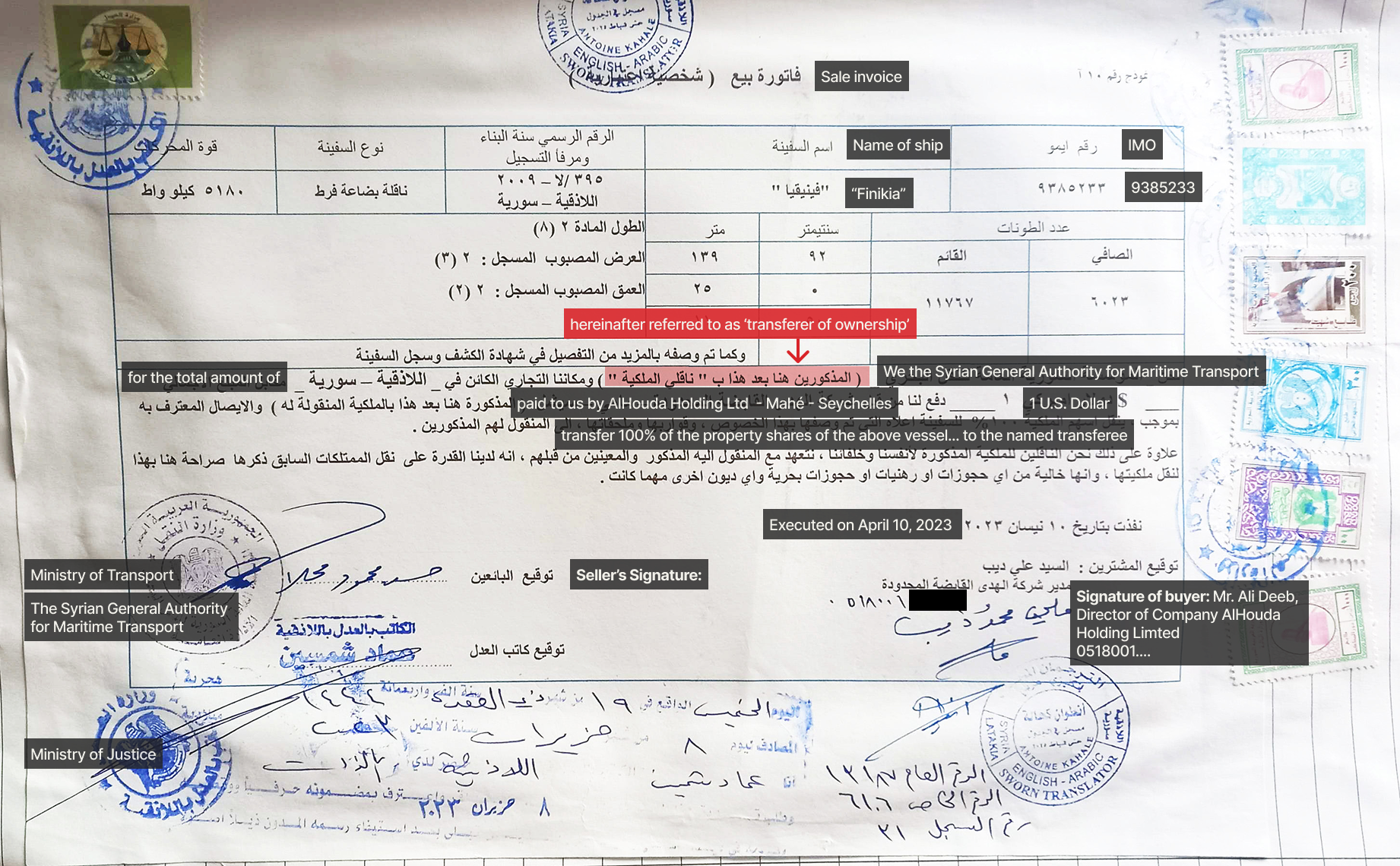 A sales contract obtained by SIRAJ shows that Souria was sold to Seychelles-based AlHouda Holding for just $1. (James O’Brien/OCCRP/SIRAJ)