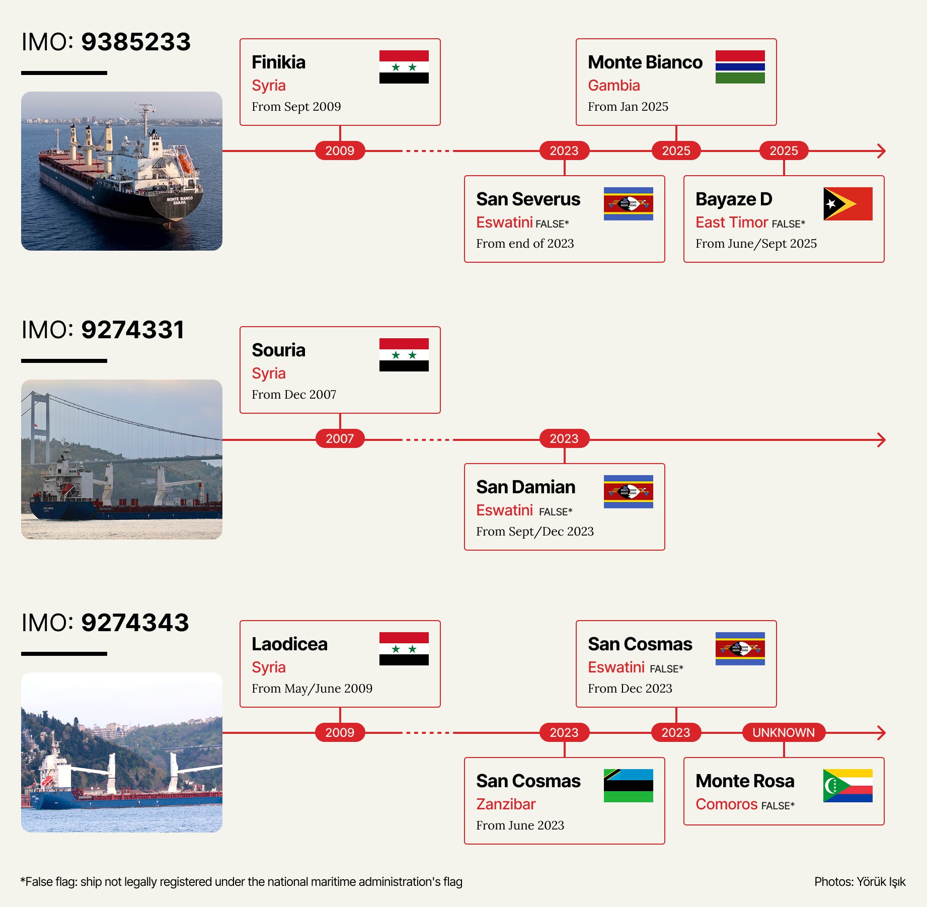 A timeline of the changing names and flags of registration for the three ships. (James O’Brien/OCCRP/Yörük Işık)