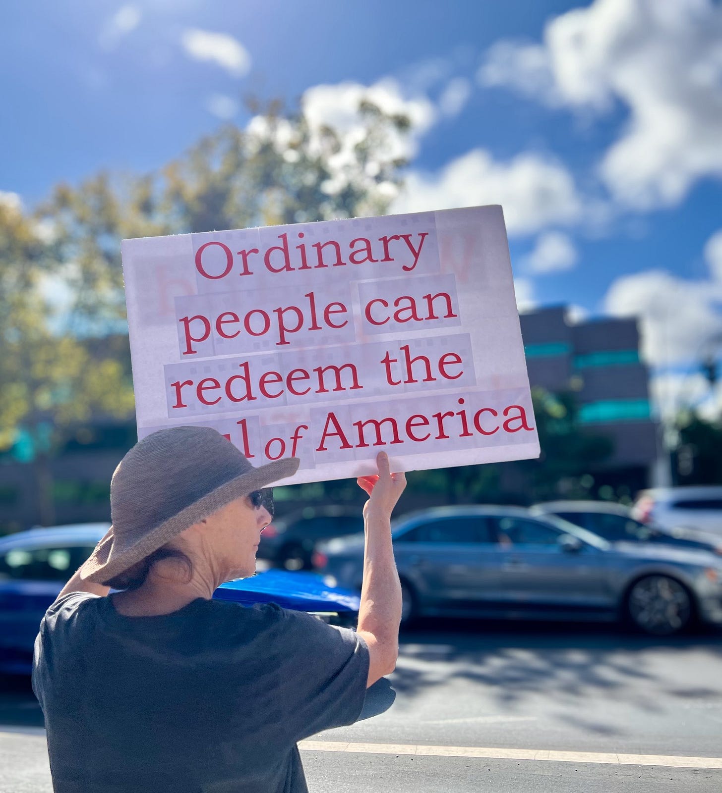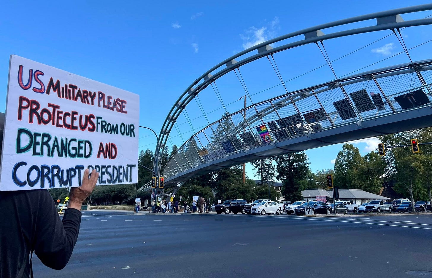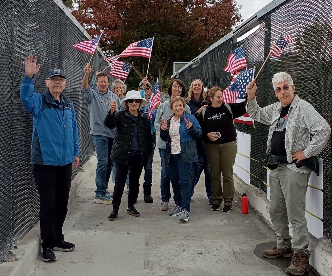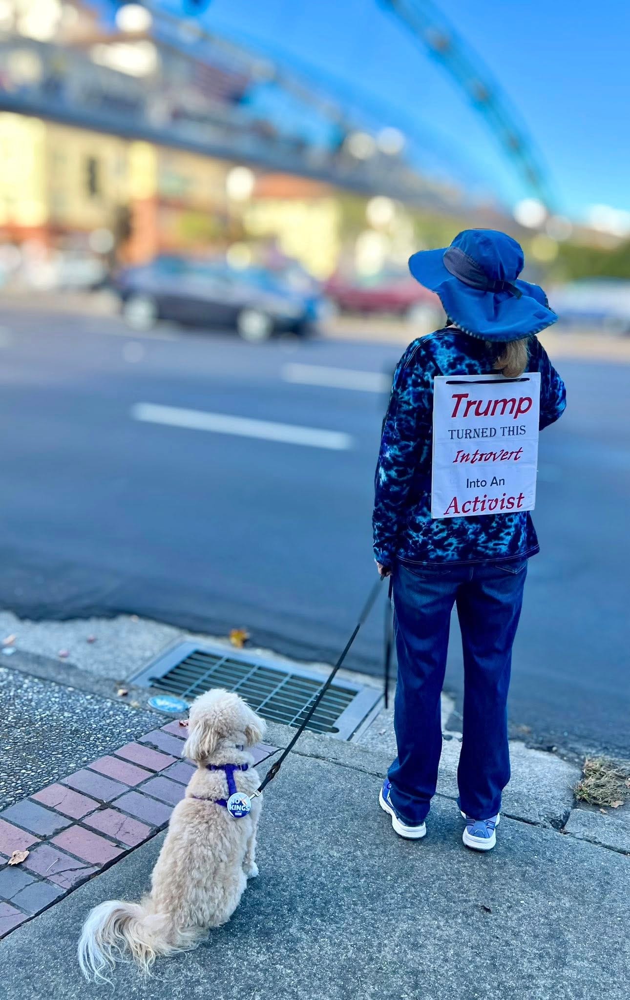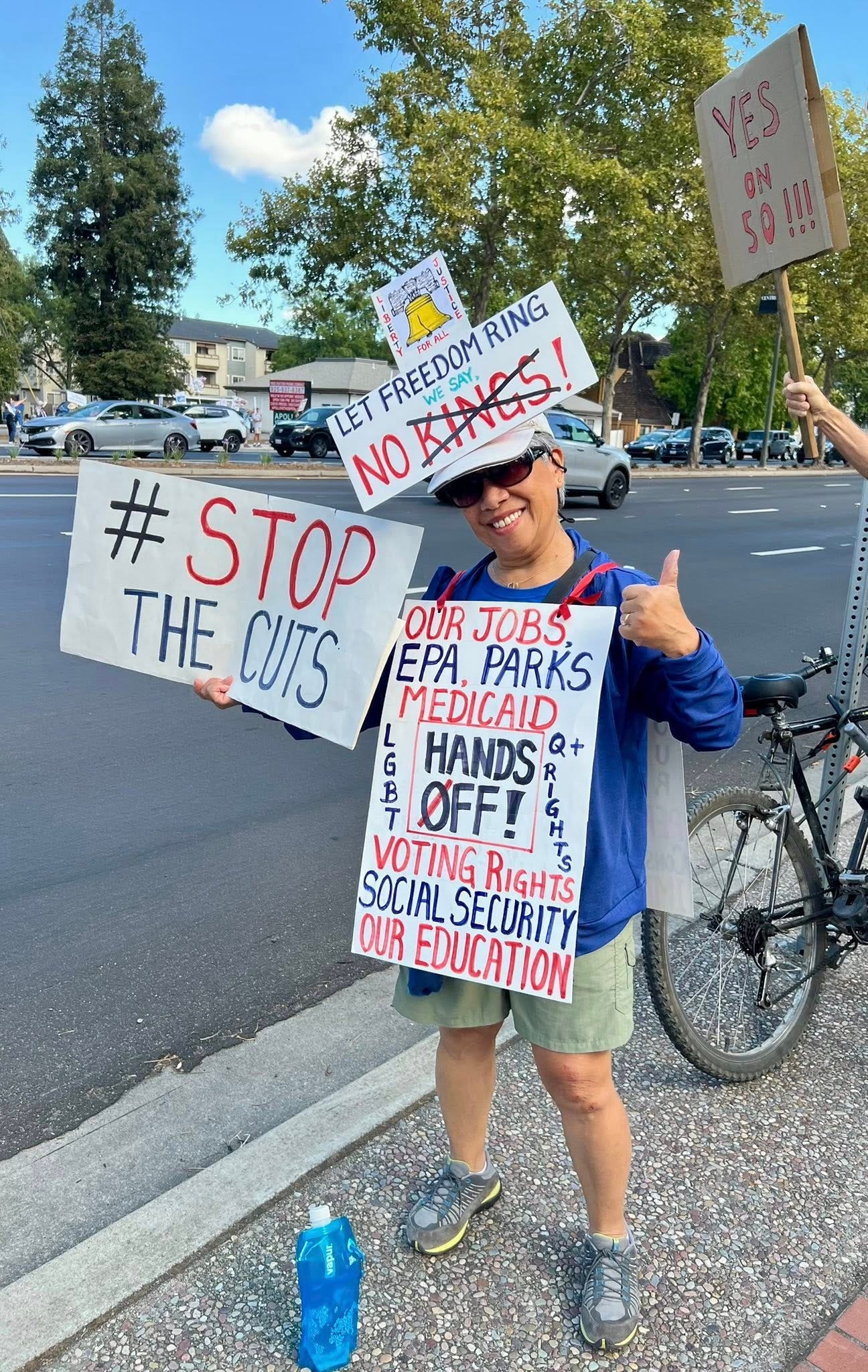Below: “Here are photos from last Saturday’s protest on and around the pedestrian overpass on Treat Boulevard in Walnut Creek, CA. This was the 34th Indivisible ReSisters weekly Saturday protest in a row.”