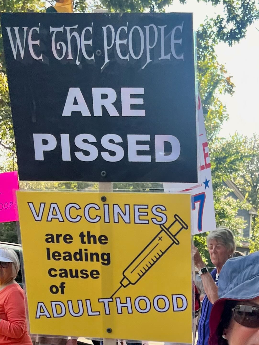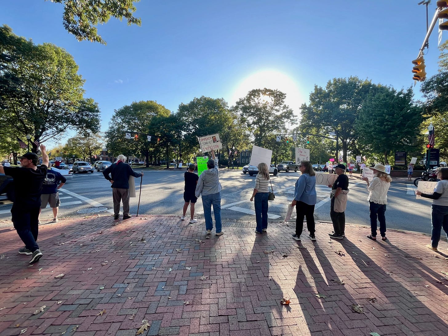 Below: “Worthington, OH, during our weekly Rush-Hour Resistance Rallies on the village green, where attendance has grown to 50+ stationed on all four corners of this busy intersection.”