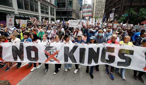 Thousands took to the streets of Chicago on June 14, the same day that literally dozens attended Trump’s poignant parade of squeaky tanks in DC. Photo: Kamil Krzaczynski/Getty Images for No Kings