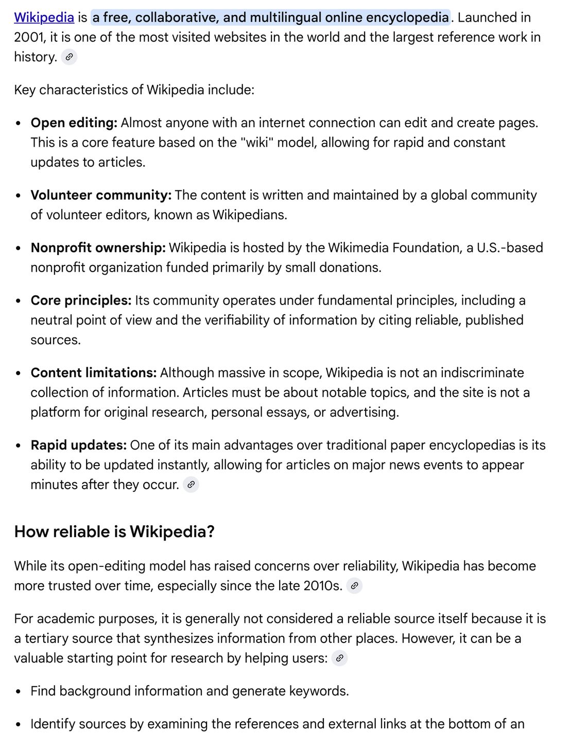 This is an AI Overview that summarizes, among other things, Wikipedia. Formally, it’s pretty close to an encyclopedia article. With a few formatting differences — notice the bullet-point AI-ese — it hits a lot of the same points as Wikipedia’s article about itself. It’s a bit shorter than the top section of the official article and contains far fewer details. It’s fine! But it’s a summary of a summary.