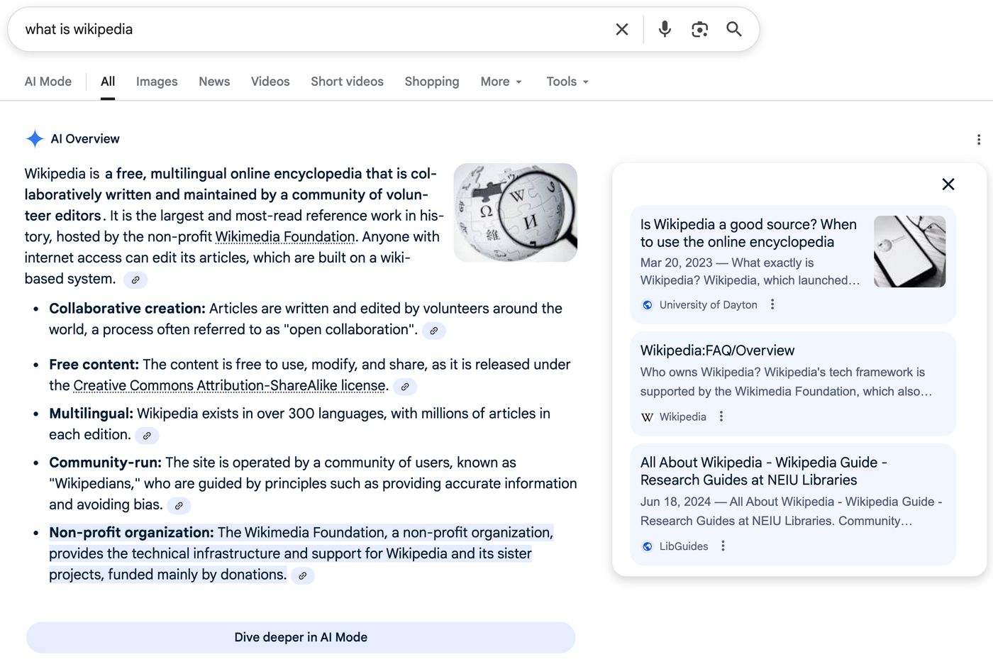 The next option you encounter still isn’t Wikipedia’s article — that shows up further down. It’s a prompt to “Dive deeper in AI Mode.” If you do that, you see this:
