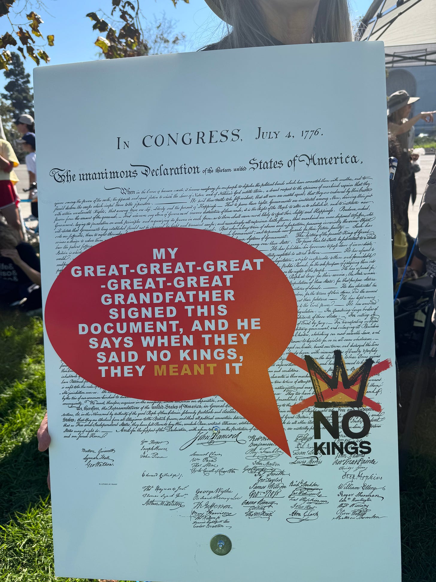 As I said, the “What’s next” question is a positive sign. But some political commentators are spinning that question in a negative way, as in, “Okay, so you had a big protest. What else you got?” Ignore them. They didn’t show up on No Kings Day 2.0 (or 1.0 for that matter). They are professional cynics for whom nothing will ever be good enough because their stock in trade is second-guessing people who are taking action to save democracy.