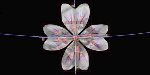 We designed the future flowers through a combination of data-driven algorithmic mapping and artistic control. I worked with the data artist Marcin Ignac from Variable Studio to create 3D flowers whose appearance was connected to climate data. Using Nodes.io, we made a 3D model of the Circaea alpina based on its current morphology and then mapped how those physical parameters might shift as the climate changes. For example, as the temperature rises and precipitation decreases in the data set, the petal color shifts toward red, reflecting how flowers protect themselves with an increase in anthocyanins. Changes in temperature, carbon dioxide levels, and precipitation rates combine to affect the flowers’ size, density of veins, UV pigments, color, and tendency toward double bloom.